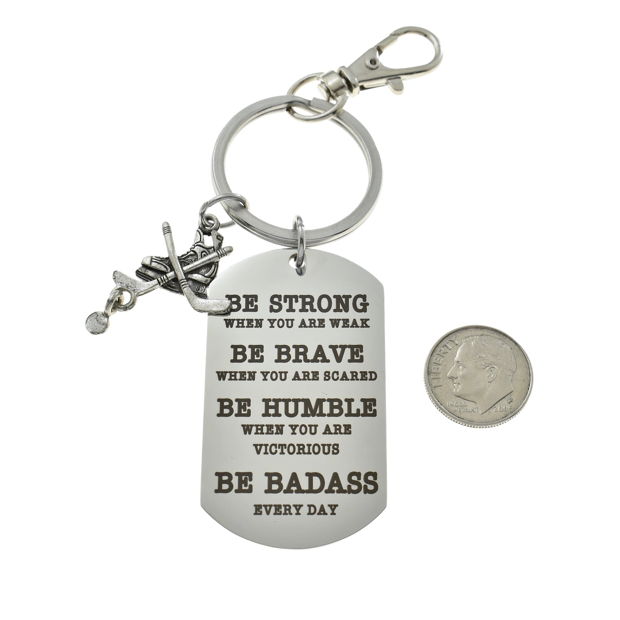 Description: Wrestling keychain on a strong stainless steel key ring. Badass word tag, key chain, and snap-hook are stainless steel. The Wrestling charm is Silver Pewter. Stainless steel dog tag has inspirational...