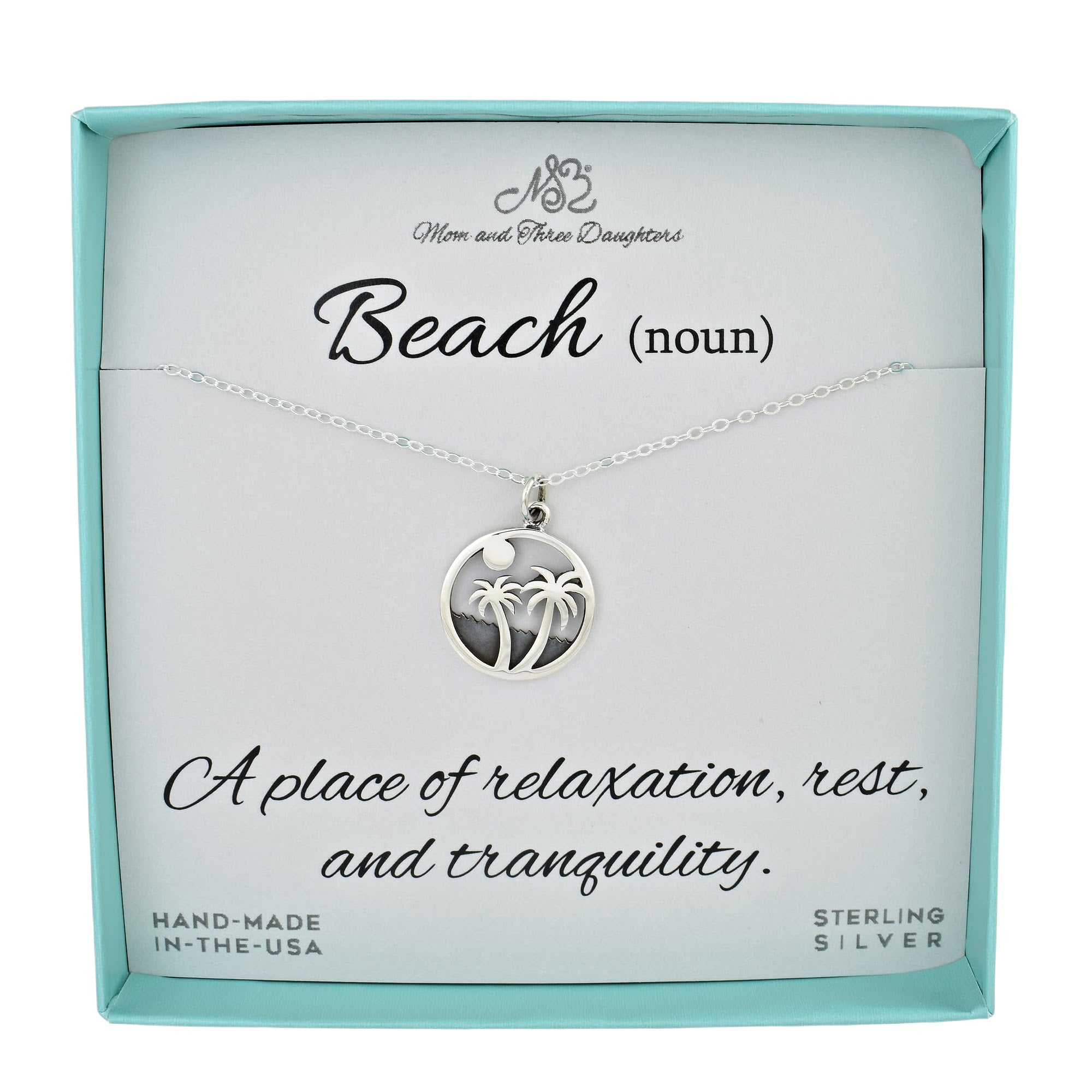 Description: Sterling silver palm tree and ocean charm on a sterling cable chain. This necklace is displayed on a card that reads: "Beach (noun) A Place Of Relaxation, and Tranquility".Measurements:...